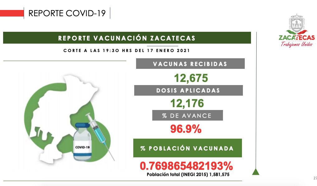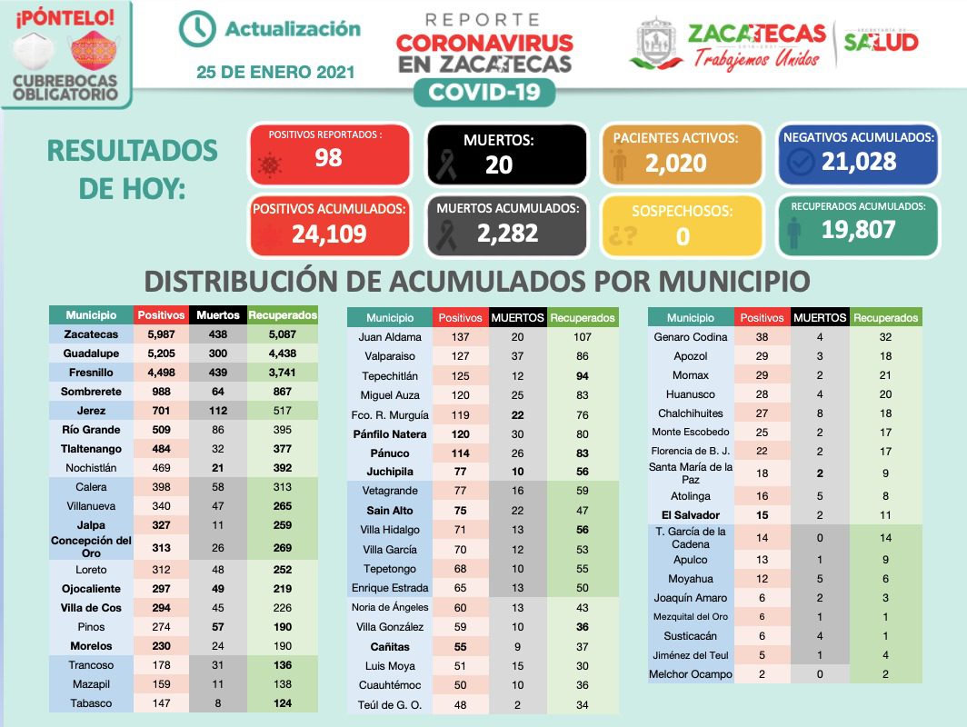 Zacatecas, Zac., 25 de enero de 2021.- Con 50 mujeres y 48 hombres reportados este lunes como positivos al SARS-CoV2, Zacatecas inicia la semana con 98 nuevos casos de este Coronavirus, con los que se acumulan 24 mil 109, de acuerdo con información de la Secretaría de Salud estatal.