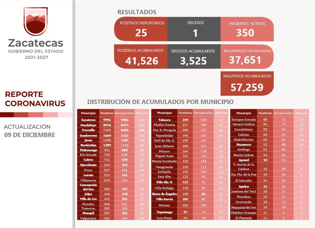 La SSZ informó que los nuevos contagios son 13 mujeres y 12 hombres. Del total, 14 son vecinos de Guadalupe, dos de Nochistlán, el mismo número de Zacatecas y, los demás viven en Apozol, Apulco, Sombrerete, Tabasco, Tepetongo, Villa García y Villa González Ortega.