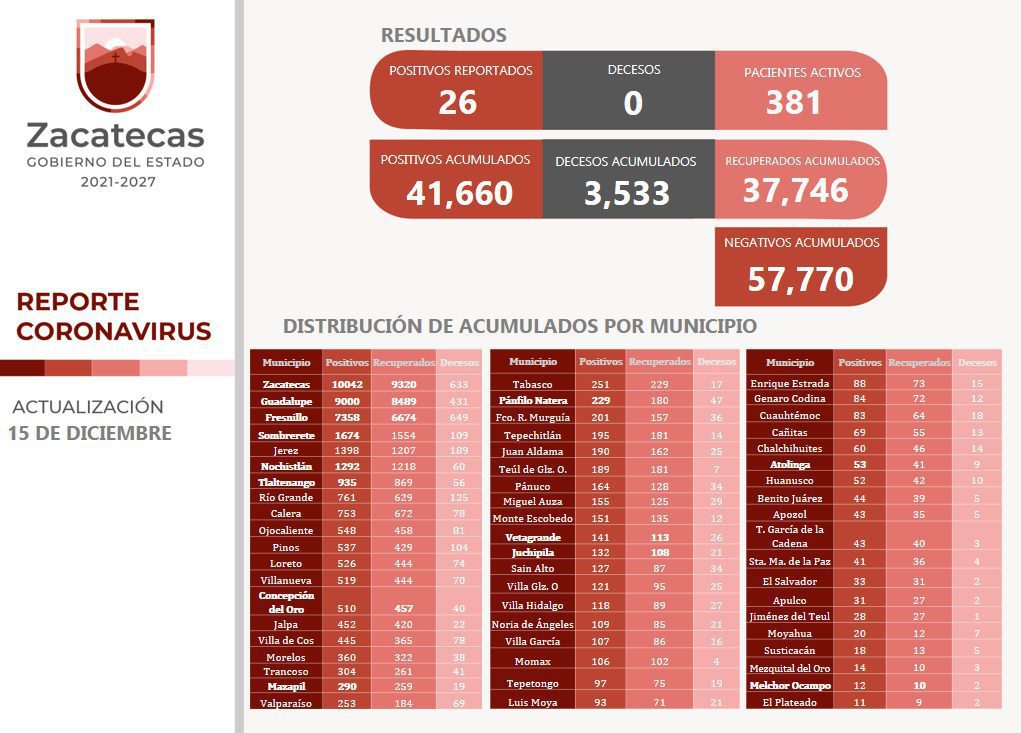 Zacatecas, Zac., 15 de diciembre de 2021.- Este miércoles, la Secretaría de Salud de Zacatecas (SSZ) no reportó defunciones por COVID-19; además, indicó que hay 10 personas más recuperadas de la enfermedad causada por el virus y 26 nuevos contagios.