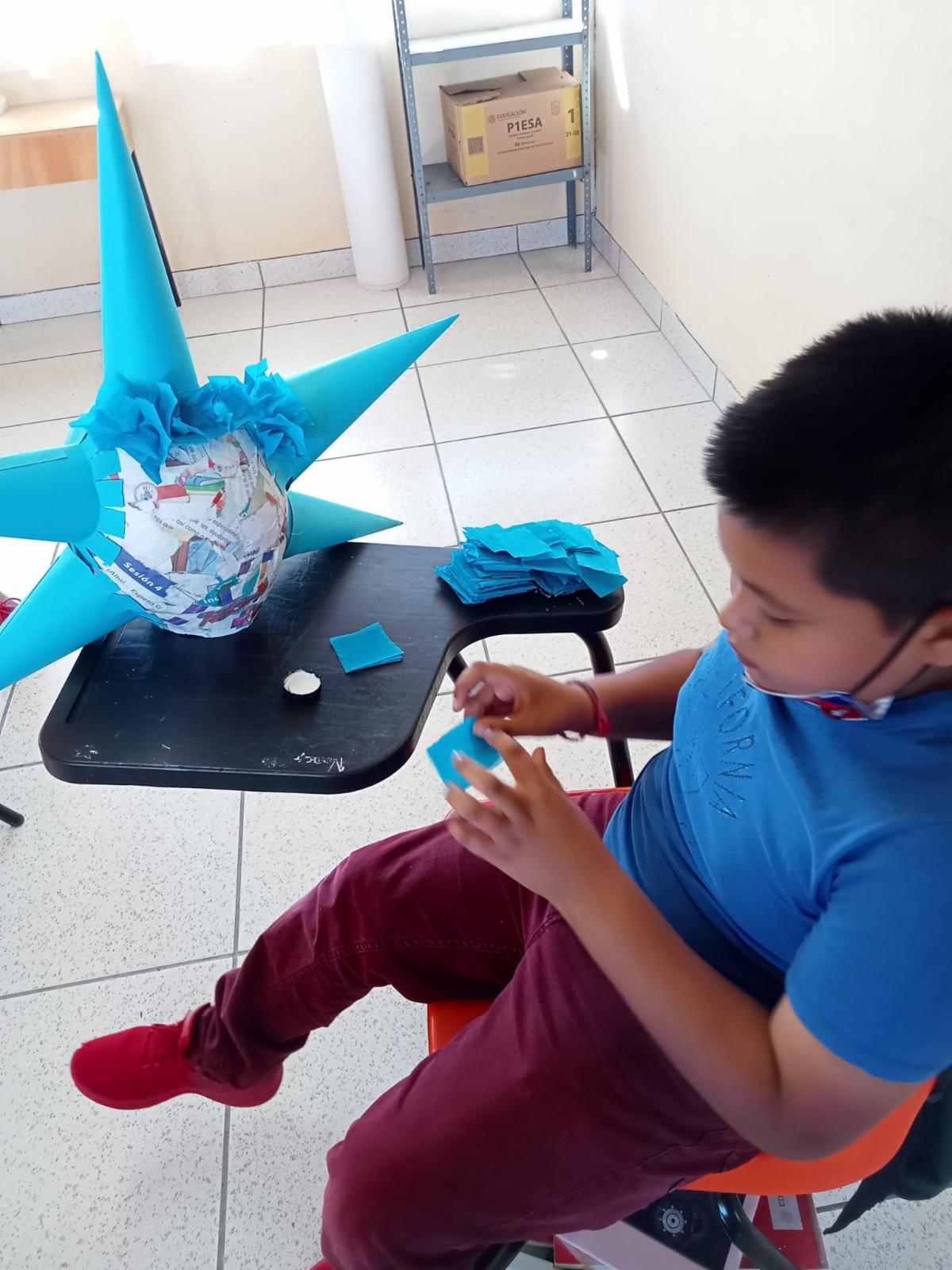 Con papel reciclable, niñas y niños de primaria elaboran piñatas con motivo de la Navidad