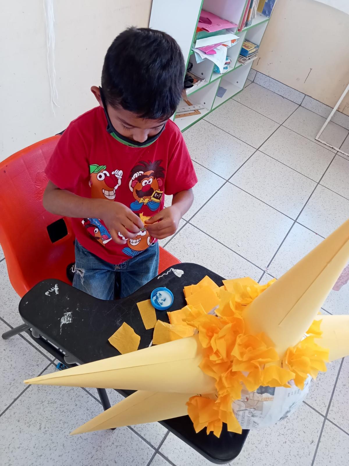De sus casas llevaron al salón de clases puñados de papeles viejos de periódico y de libretas usadas, a fin forrar el globo. Con papel cartoncillo les dieron forma a los picos y, finalmente, las vistieron con papeles crepé y china.