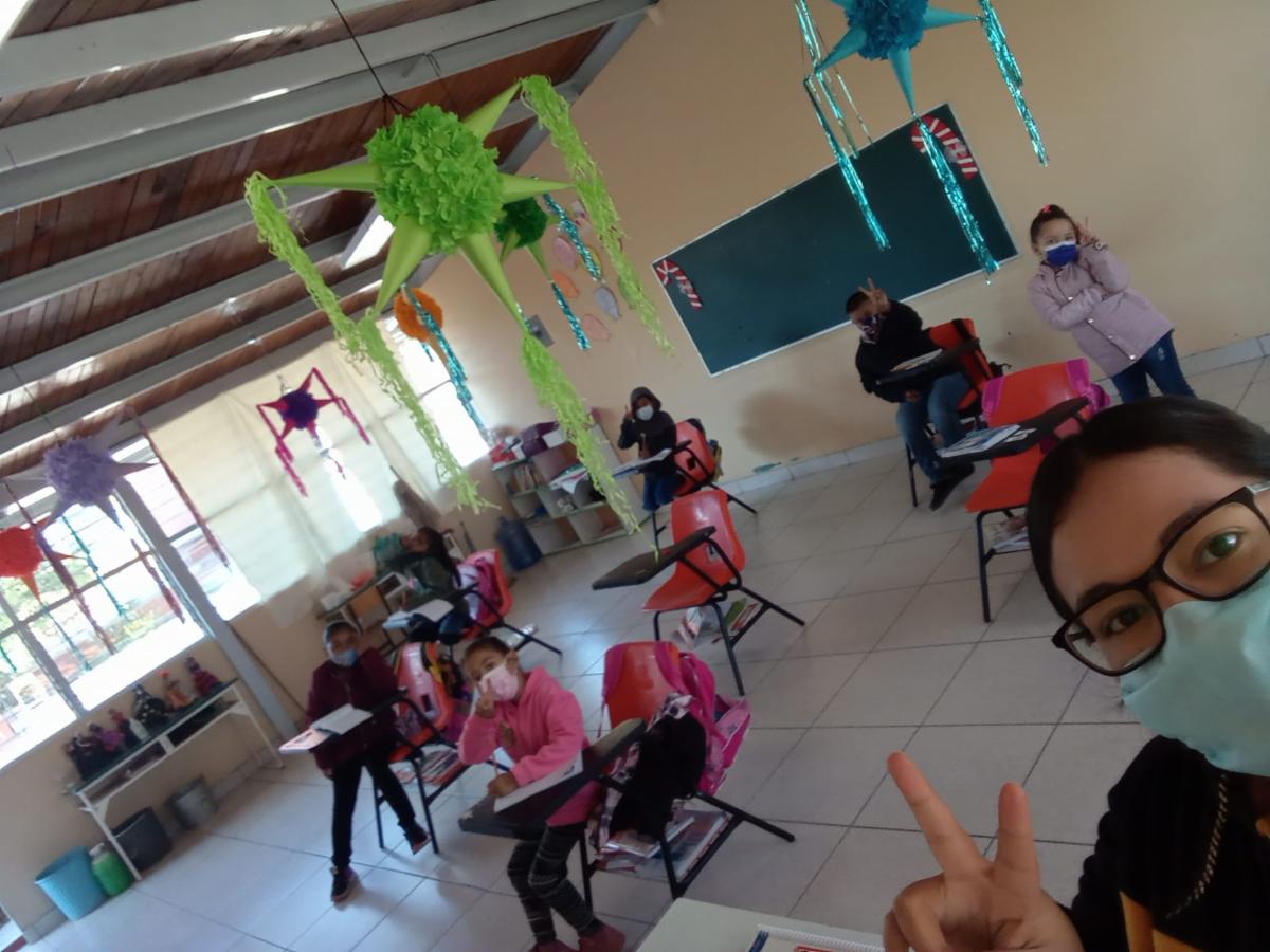 En este lugar, el polvo invisible de la magia de la Navidad inundó un salón de clases con piñatas de colores brillantes, elaboradas con material reciclable por los propios alumnos y alumnas.