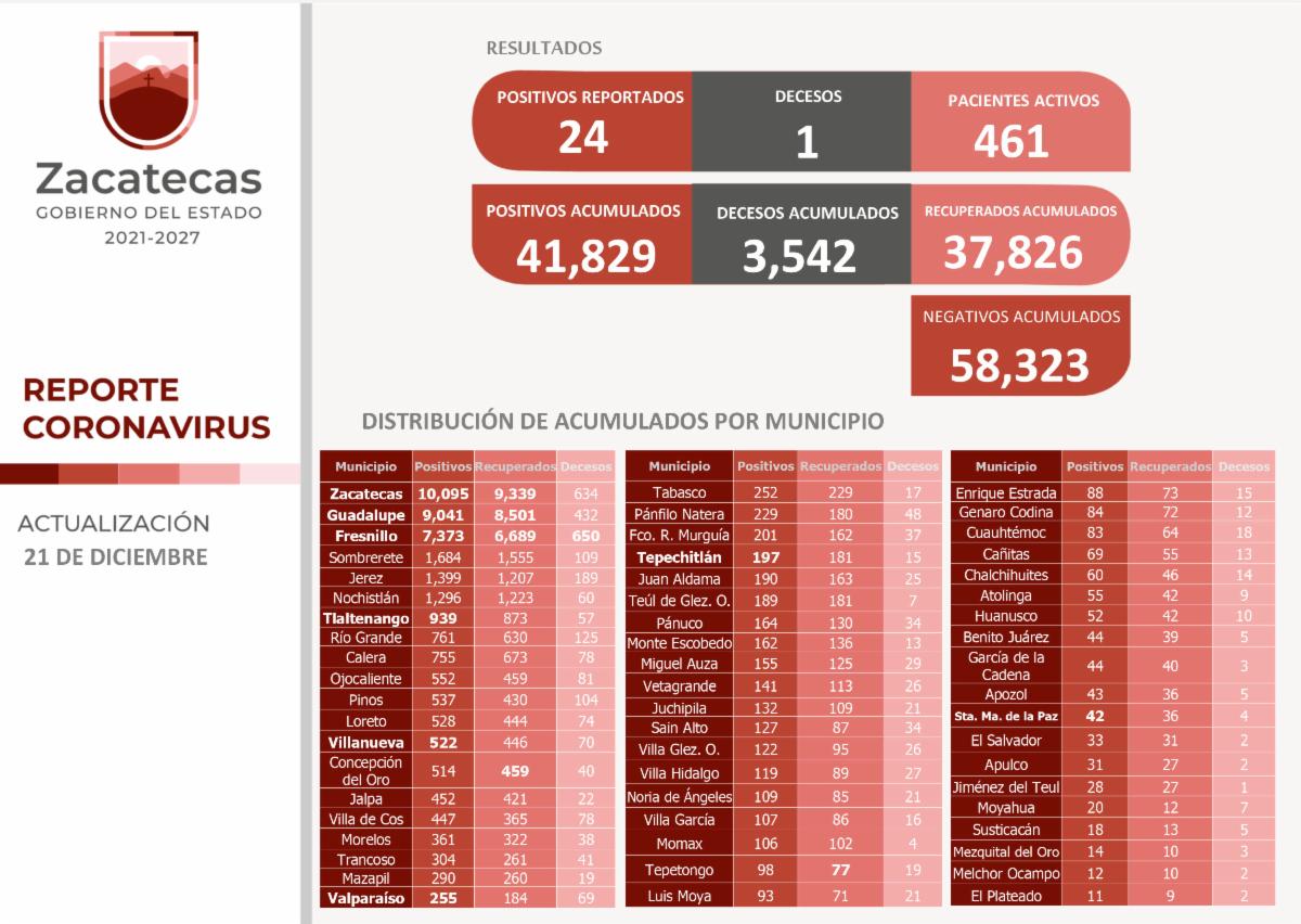 Así, la SSZ reporta que en Zacatecas se acumulan 41 mil 829 casos de Covid-19, 37 mil 826 recuperados y 3 mil 542 decesos.
