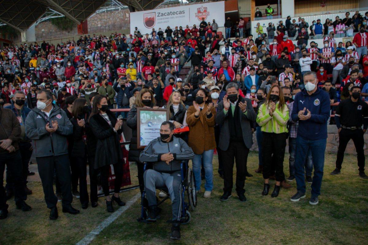 Un reconocimiento que llegó al corazón de las y los zacatecanos e incluso causó las lágrimas de la principal figura que ha tenido Zacatecas en el futbol, fue el que realizó este miércoles el mandatario estatal, acompañado por los directivos de las fundaciones Isauro López y Jorge Vergara AC, así como del Rebaño Sagrado y de Mineros, en el estadio Carlos Vega Villalba.