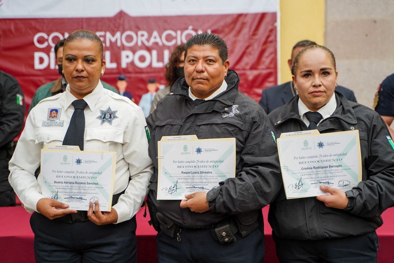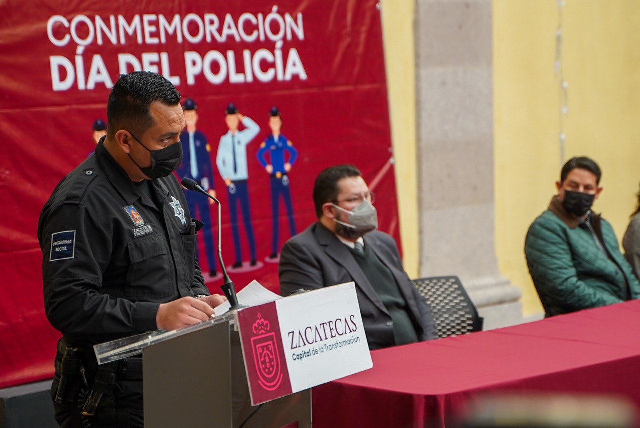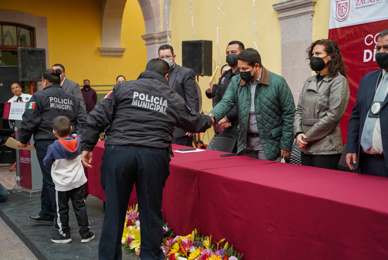 • El Ayuntamiento de Zacatecas otorgó 17 reconocimientos a elementos destacados de seguridad.El alcalde capitalino, Jorge Miranda Castro, en conjunto con el titular de la Secretaría de Seguridad Pública, Gustavo Serrano Osornio, celebraron y reconocieron el esfuerzo que día a día hacen los policías municipales de Zacatecas por velar y trabajar en pro de la ciudadanía.Lo anterior, en el marco del Día del Policía en México, que se conmemora el 2 de enero de cada año.El evento protocolario se llevó a cabo en la Casa Municipal de Cultura, donde el primer edil y el titular de seguridad entregaron reconocimientos a quienes honran a la corporación municipal desde hace algunos años.