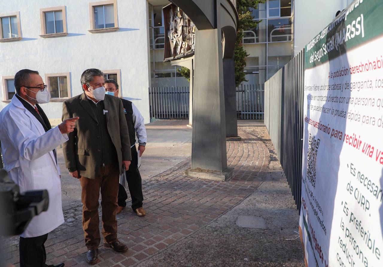 El Gobernador David Monreal dio un recorrido por la Torre B del Hospital del IMSS para constatar la operación del MACROMARSS, donde existen filtros para que médicos, enfermeras y especialistas atiendan de forma integral a quienes presentan síntomas de COVID-19 y, a la vez, hagan la canalización pertinente.