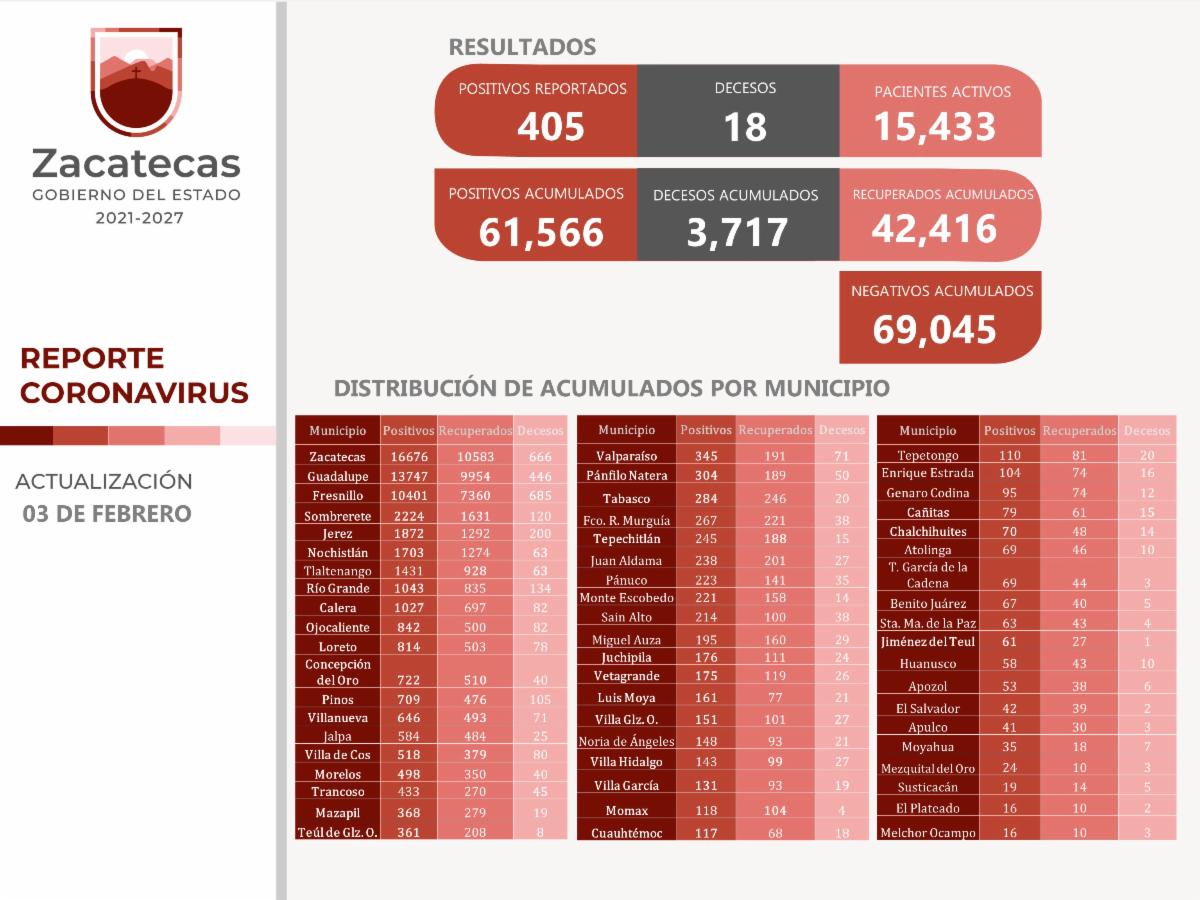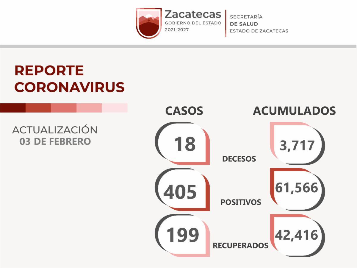 Zacatecas, Zac., 3 de febrero 2022.- Para este jueves, el reporte de la situación del COVID-19 en Zacatecas arroja la recuperación clínica de 199 personas, 405 nuevos casos y 18 decesos, aunque sólo dos de los fallecimientos ocurrieron en el presente mes, los 16 restantes se registraron en enero.