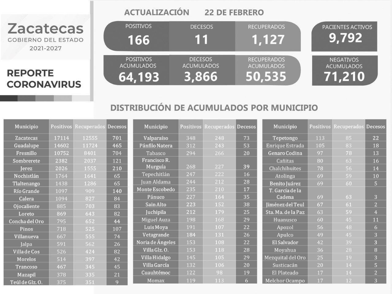 Zacatecas, Zac., 22 de febrero de 2022.- Este martes, Zacatecas registró a 1 mil 127 personas recuperadas del coronavirus, con lo cual, el acumulado en este rubro es de 50 mil 535. El reporte diario del comportamiento de la pandemia indicó que los casos positivos fueron 166 y los decesos, 11.