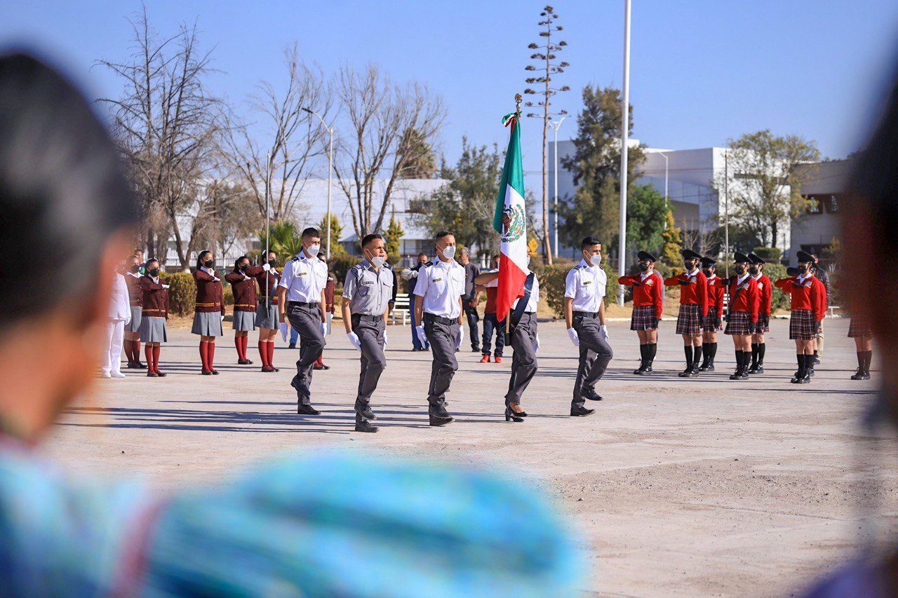 Fresnillo, Zac.- En el marco de la conmemoración del Día de la Bandera, este jueves se llevó a cabo el Cuarto Concurso de Escoltas de Bandera, donde los grupos Pentatlón Varonil, Pentatlón Juvenil y el Pentatlón Menor A obtuvieron los primeros lugares de las categorías Libre, Secundaria y Primaria, respectivamente.