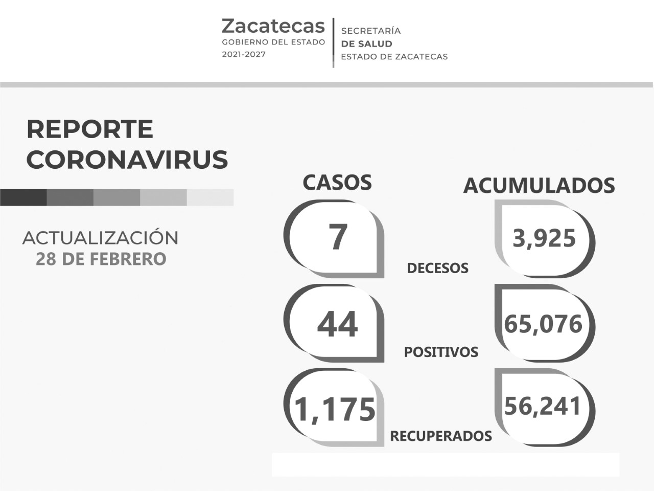 Zacatecas, Zac., 28 de febrero de 2022.- Zacatecas registró hoy a 1 mil 175 personas recuperadas del COVID-19, así como 44 casos positivos y siete defunciones por complicaciones a causa del virus, informó la Secretaría de Salud estatal.