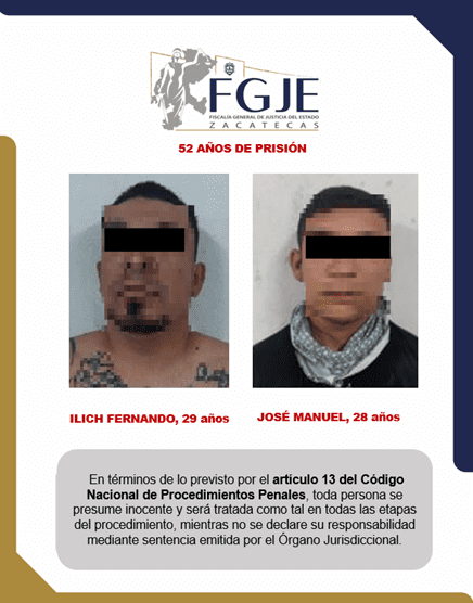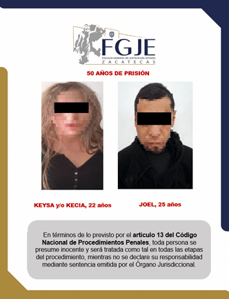 En fecha 22 de febrero al concluir el Juicio Oral de dos jóvenes originarios de Zacatecas y Guadalupe, de 22 y 25 años, KEYSA o KECIA y JOEL, fueron condenados a 50 años de prisión por el delito de secuestro agravado, hechos sucedidos en el mes de diciembre del 2019 en el municipio de Guadalupe.