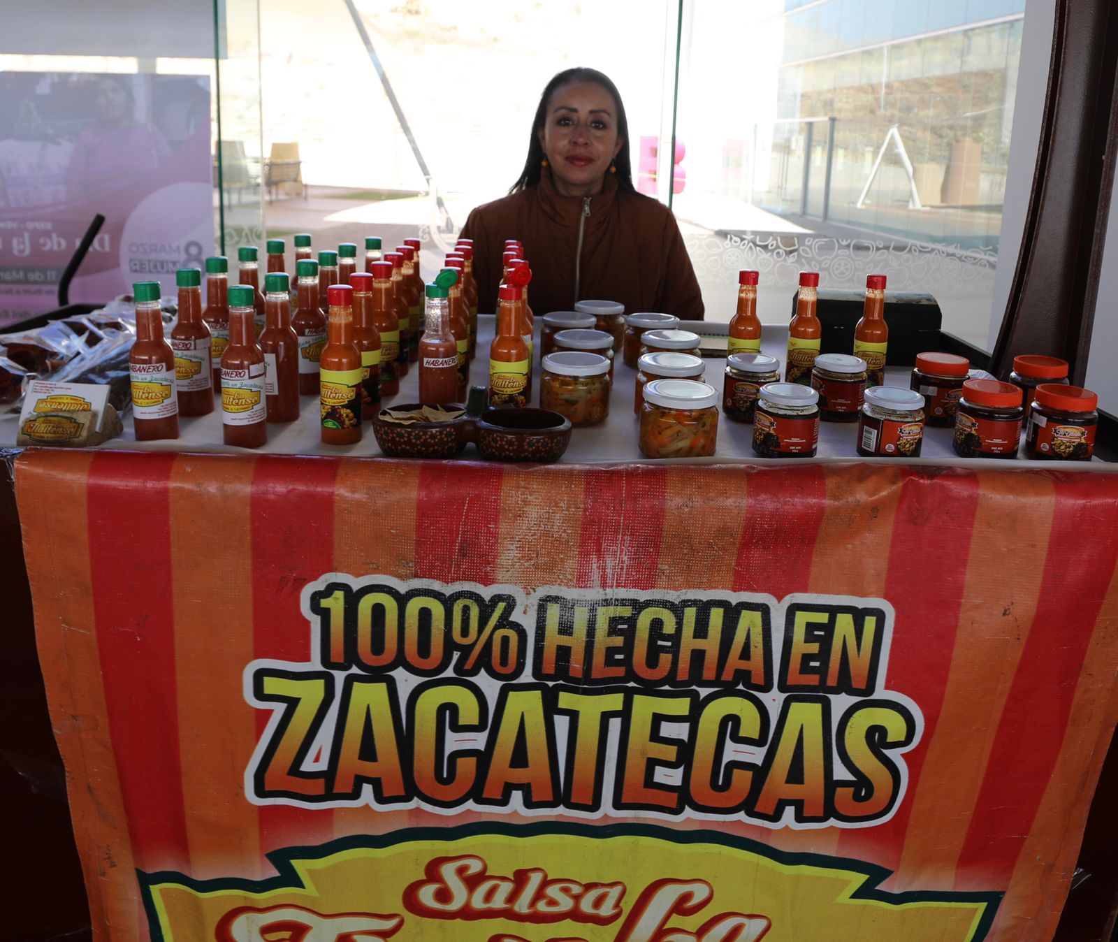 La expo estuvo conformada por siete artesanas especializadas en rebozos deshilados, joyería en plata, arte wixarika, labores de aguja, además de 10 negocios liderados por mujeres zacatecanas como Beymar, de productos encurtidos; La tlaltense, de salsas de cacahuate; Maurikka, de queso añejo; El otoñal, de miel y sus derivados; Agaveros y Mezcaleros; Campechanas de Zacatecas; Chocolates Don Carmelo; Chocolate Almaraz, así como carne seca El Carmen.