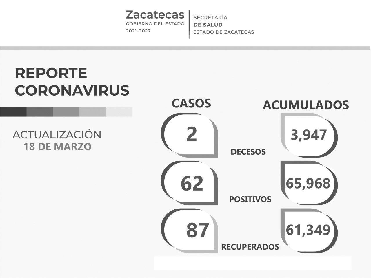 Zacatecas, Zac., 18 de marzo de 2022.- La Secretaría de Salud de Zacatecas (SSZ) reportó la recuperación de 87 personas que habían contraído el COVID-19, así como 62 nuevos contagios y dos defunciones asociadas a la enfermedad, en las últimas 24 horas.