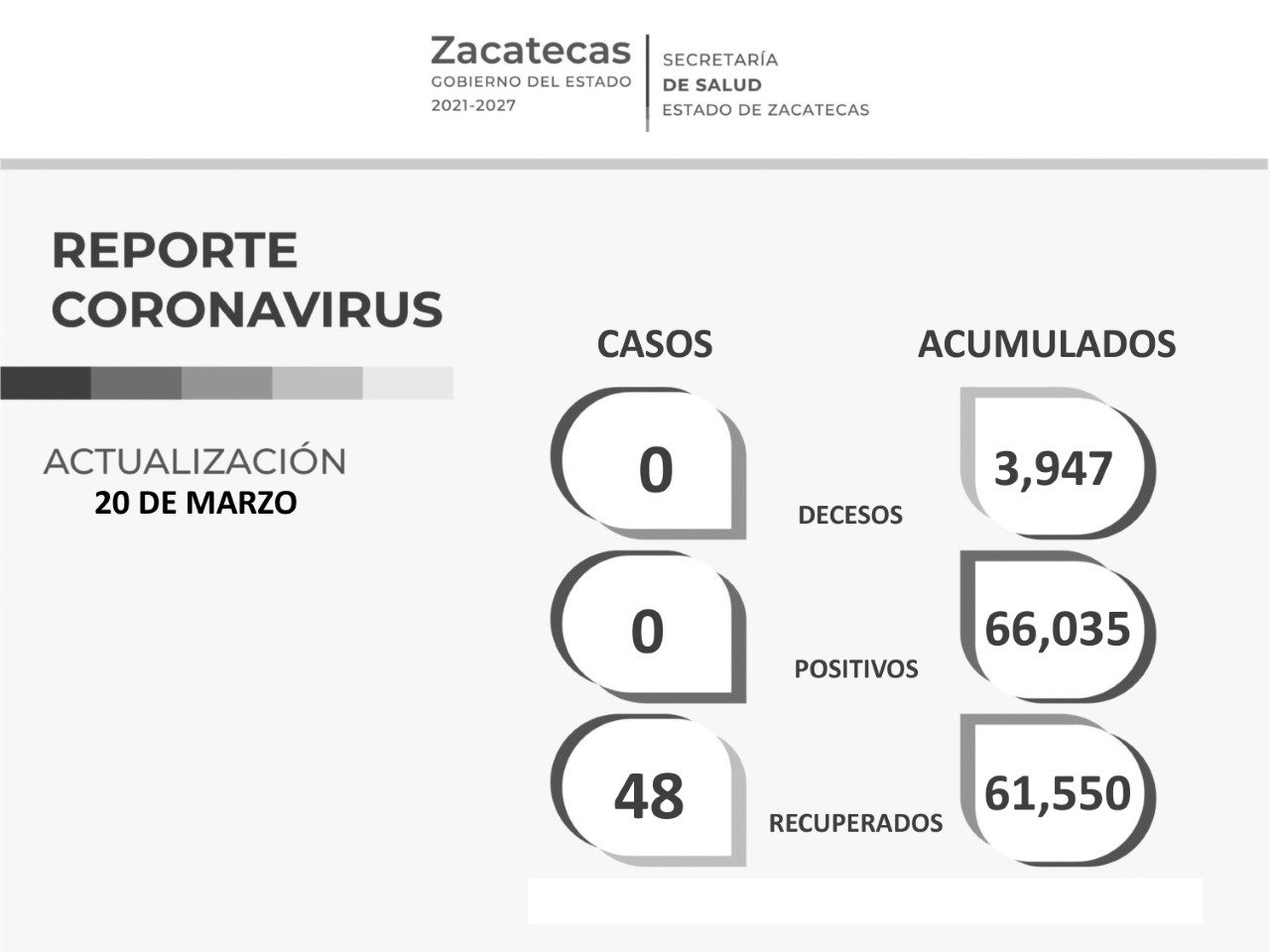Zacatecas, Zac.- Como un dato alentador sobre el comportamiento de la pandemia por COVID-19, este domingo en Zacatecas se registraron solamente personas recuperadas del COVID-19 y ningún contagio ni deceso por la enfermedad, de acuerdo al reporte de la Secretaría de Salud estatal.