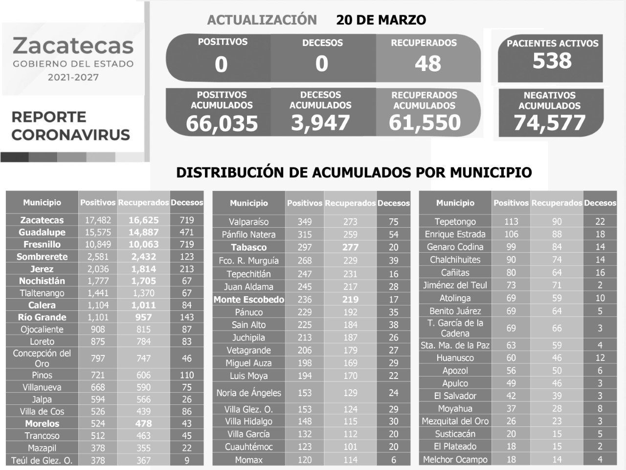 Zacatecas, con 24 horas sin contagios ni muertes por COVID-19; se recuperaron 48 personas