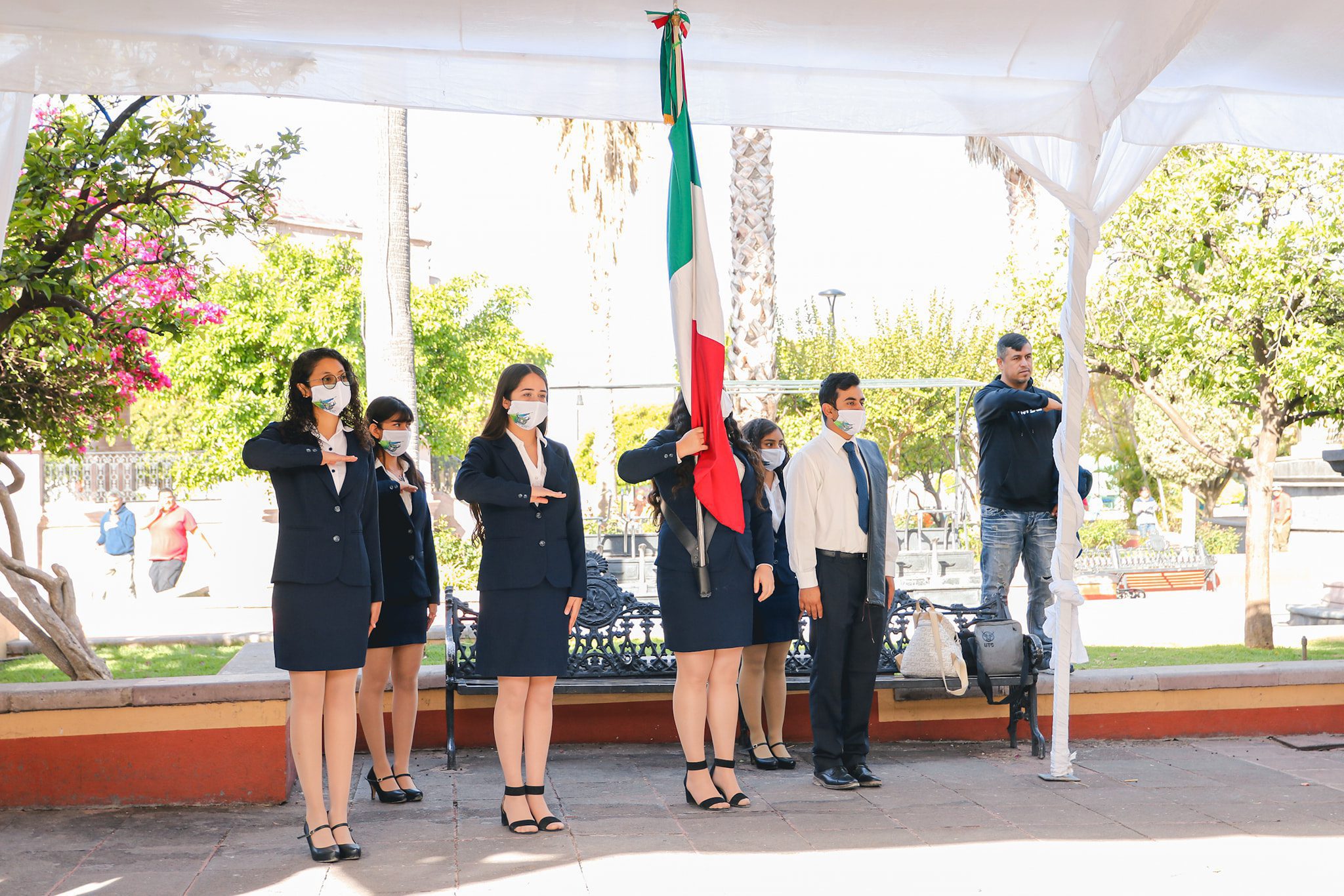 El presídium por conformaron el presidente municipal de Calvillo, Daniel Romo Urrutia y el rector de la UT Calvillo, Javier Valdivia, colocaron una ofrenda floral al Benemérito de las Américas posterior a los honores a la Bandera.