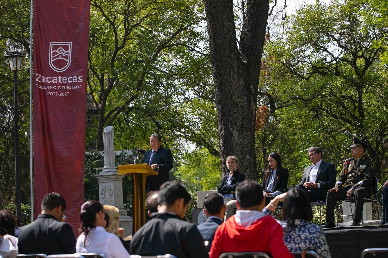 - El Gobernador, junto al Senador Ricardo Monreal; la Directora del IZC, María de Jesús Reyes, y el poeta Fernando Fernández, ganador del Premio Iberoamericano Ramón López Velarde 2022, encabezó la ofrenda floral al vate jerezano