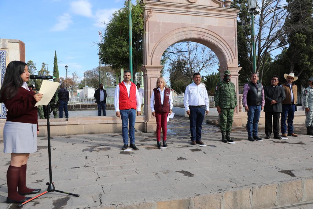 Cañitas de Felipe Pescador, Zac., 12 de julio de 2022. Desde que asumí el mandato constitucional que me confirió el pueblo, en la administración pública trabajamos para encauzar a Zacatecas por el sendero del bienestar y del desarrollo, manifestó el Gobernador David Monreal Ávila al encabezar la ceremonia de Honores a la Bandera en el municipio de Cañitas de Felipe Pescador.