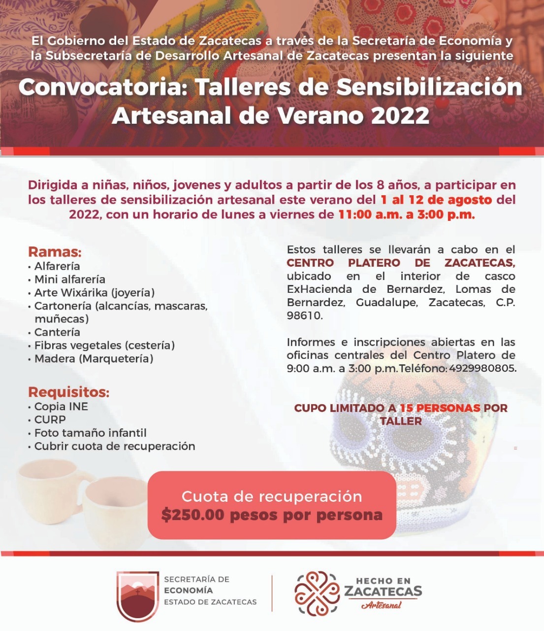 Zacatecas, Zac., 19 de julio de 2022.- Con el objetivo de promover las tradiciones y cultura de Zacatecas, el Gobierno que encabeza el mandatario David Monreal Ávila, a través de la Secretaría de Economía y la Subsecretaría de Desarrollo Artesanal, pone a disposición de toda la población los talleres de sensibilización artesanal de verano 2022.