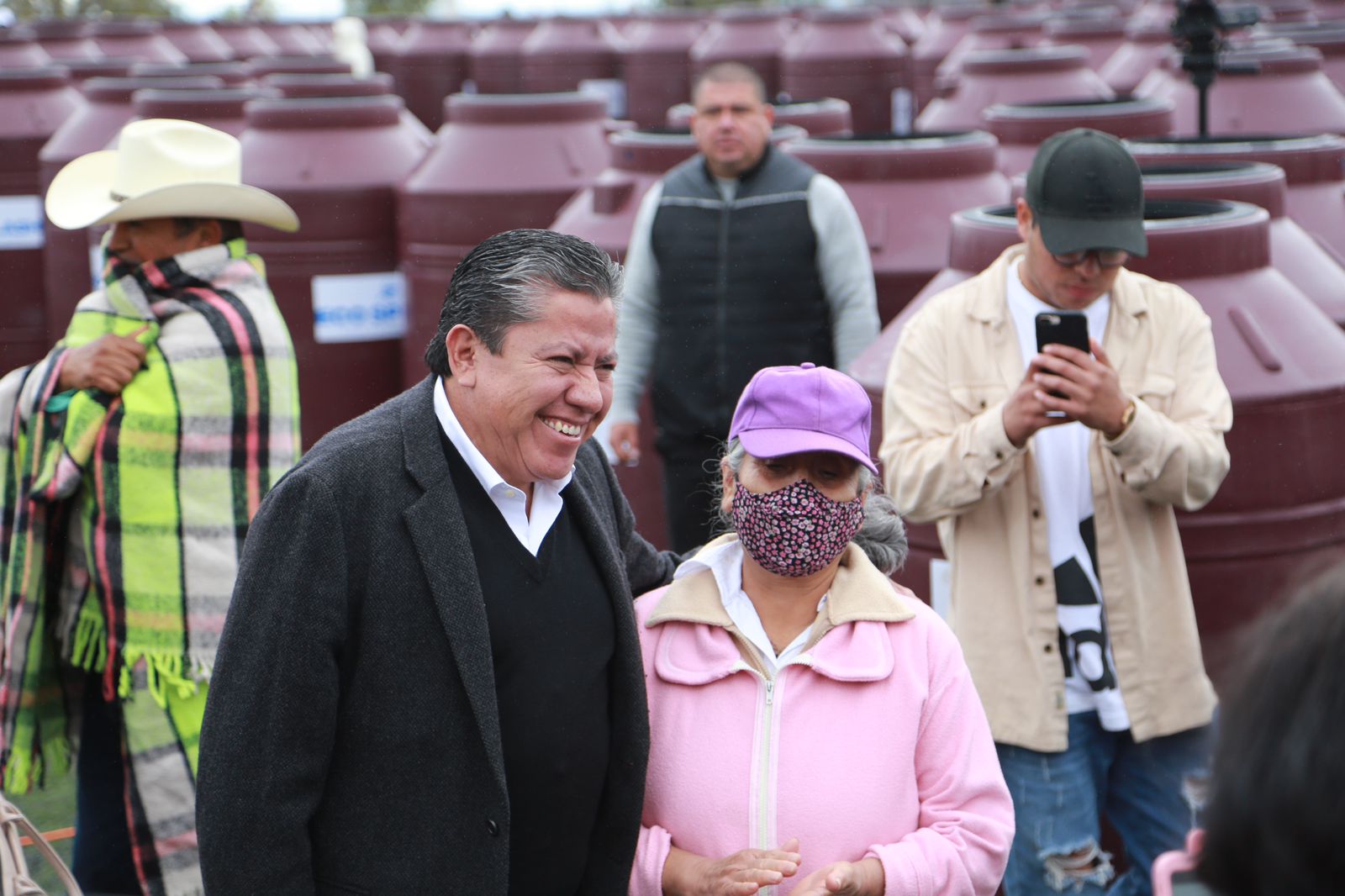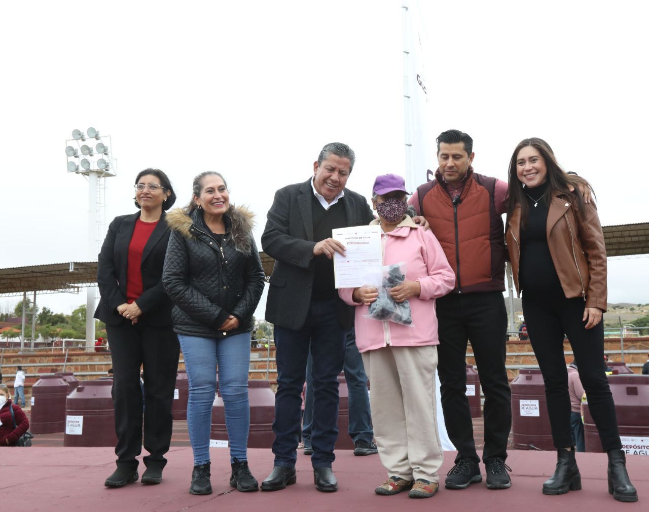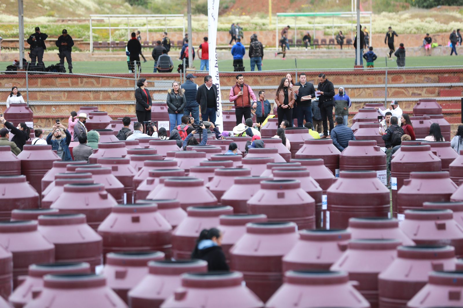 Reunidos en la Unidad Deportiva de este municipio, el mandatario y el alcalde otorgaron los tinacos a familias de colonias y comunidades como, Arte Mexicano, Luis Donaldo Colosio, Tacoaleche, Ojo de Agua de la Palma, Mezquital, Tierra y Libertad, Ampliación Minas, por mencionar algunas.