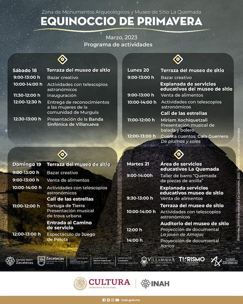 En ese sentido, la Secretaría de Obras Públicas (SOP), el Instituto Zacatecano de Cultura, la Secretaria de Economía, el INAH, la Sociedad Astronómica de Zacatecas y el Ayuntamiento de Villanueva, reiteran la invitación a las y los zacatecanos y visitantes a participar en las actividades que se realizarán en la zona arqueológica y en el museo de sitio, ubicados en el municipio de Villanueva, del 18 al 21 de marzo, de las 10:00 a las 13:00 horas.