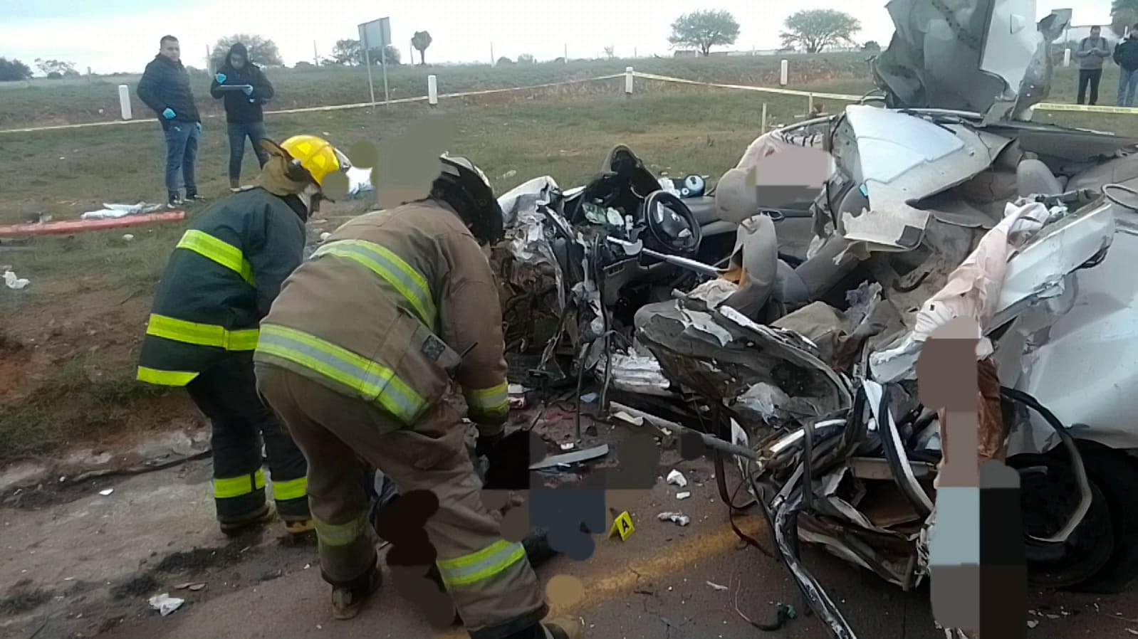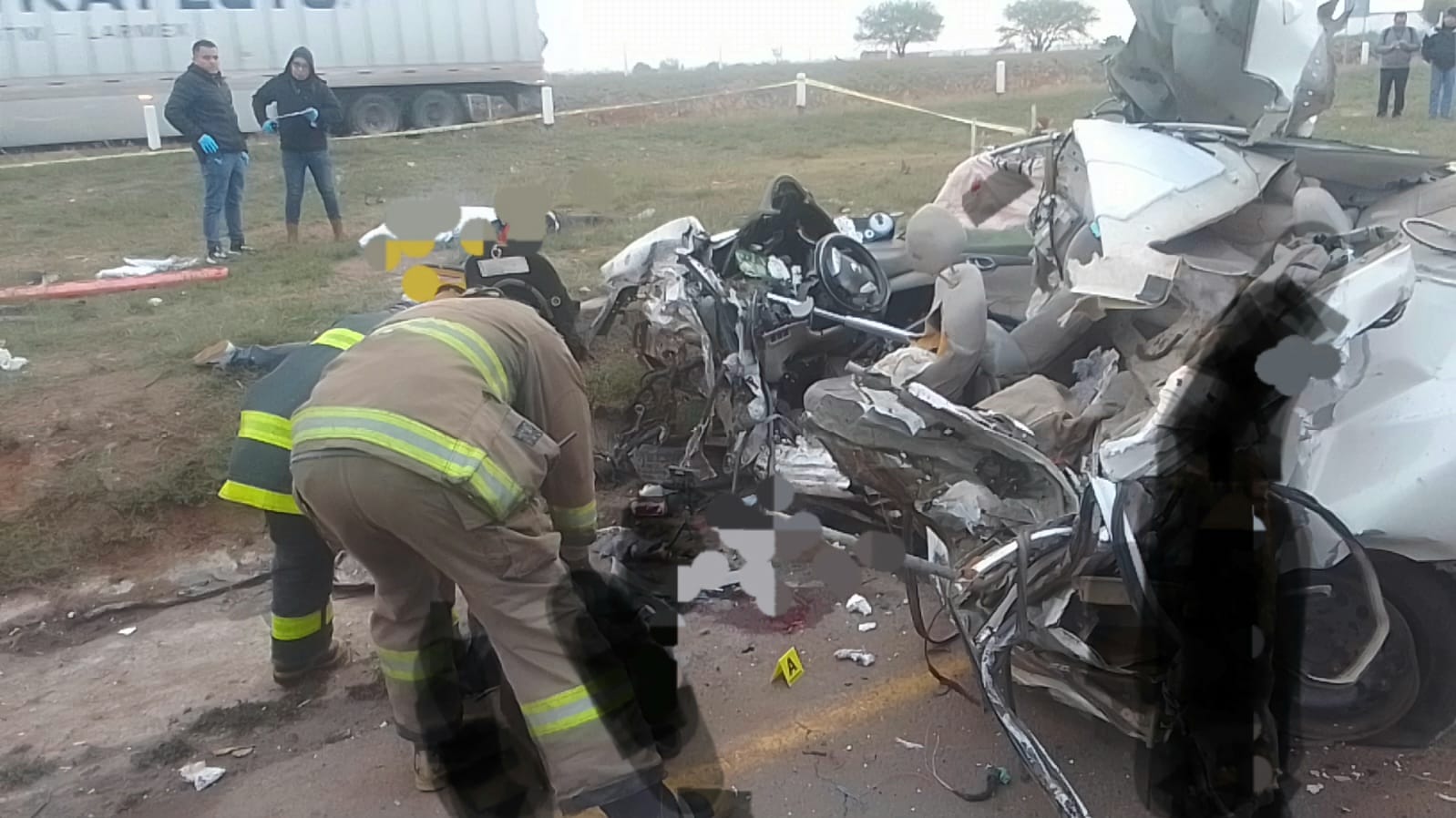 El informe preliminar indica que el pesado autobús colisionó con un Nissan Sentra blanco con placas de Zacatecas, en el que viajaban dos hombres y una mujer, todos lamentablemente sin signos vitales.