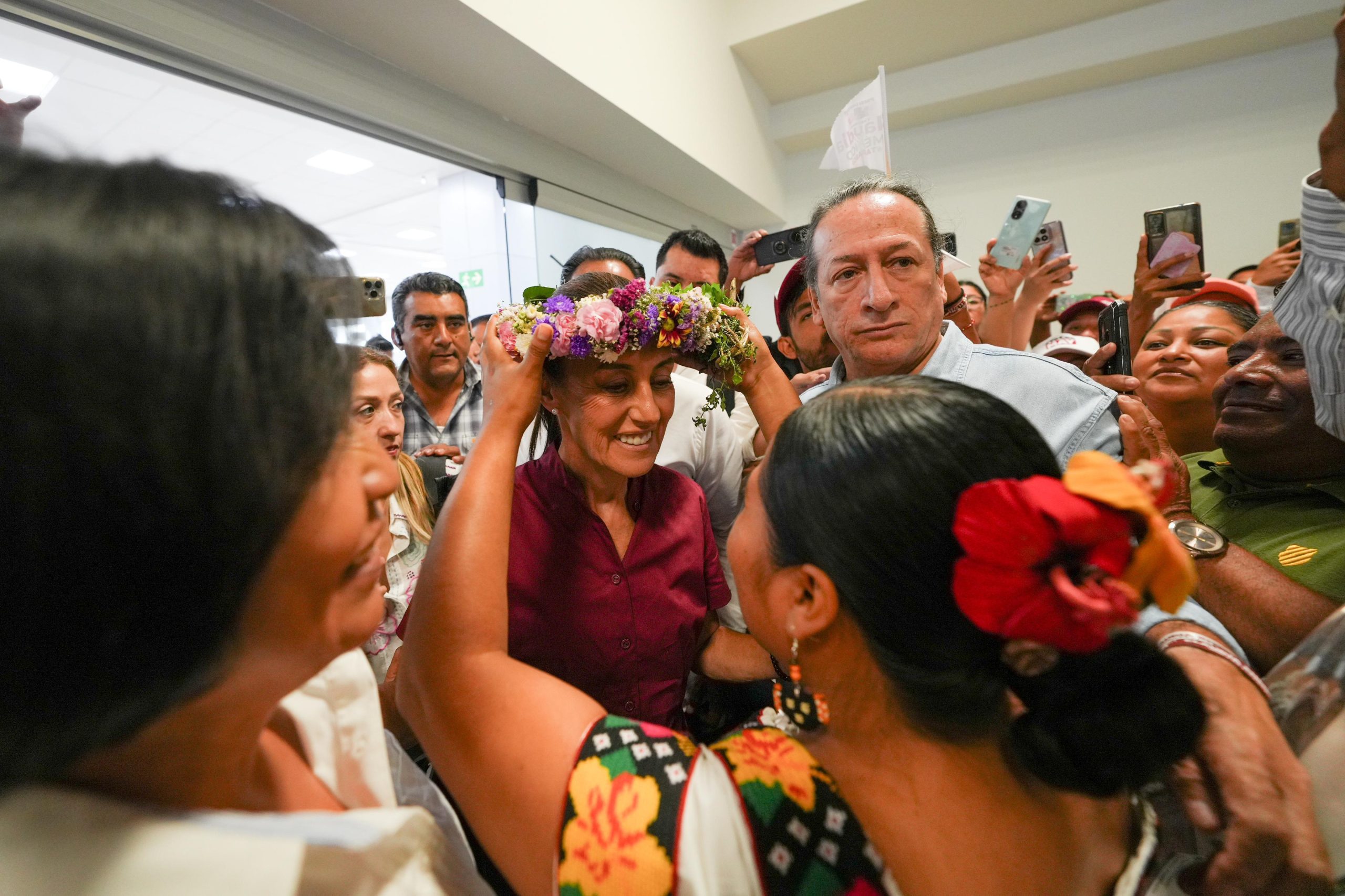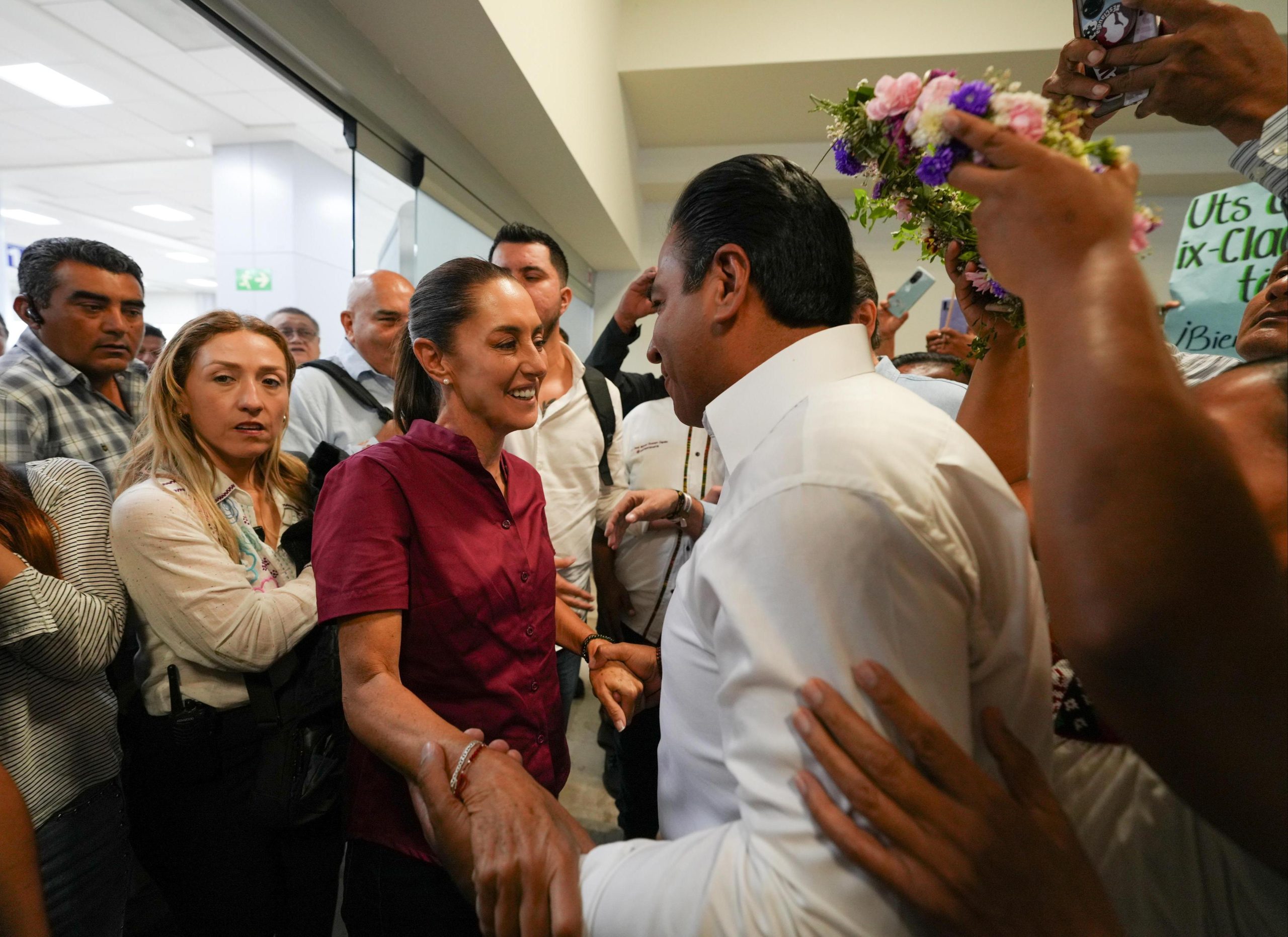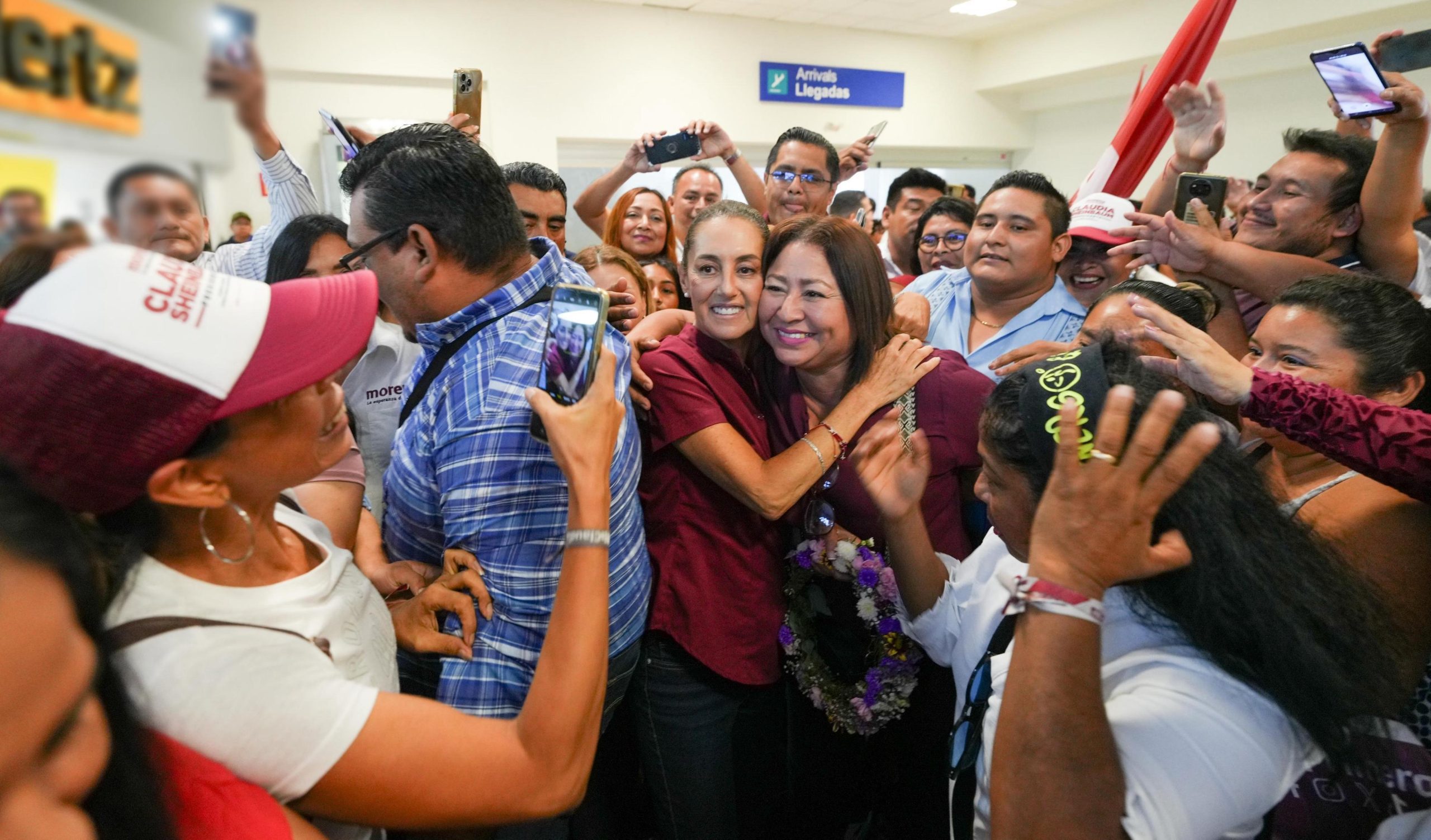 Villahermosa, Tabasco, a 20 de abril de 2024.- Con porras y abrazos, Claudia Sheinbaum, candidata a la Presidencia de México por la Coalición “Sigamos Haciendo Historia” (Morena-PT-PVEM), llegó al Aeropuerto Internacional de Villahermosa, Tabasco, donde le dieron la bienvenida cientos de militantes y simpatizantes, entre los que se destacaron grupos de mujeres y jóvenes. A su llegada, Claudia Sheinbaum recibió un ritual de purificación con hierbas de albahaca y una corona de flores, realizado por una mujer representante de las comunidades originarias del municipio de Nacajuca, esto con el objetivo de desearle buena suerte en su camino, así como purificar las energías para garantizar que el proyecto del segundo piso de la 4T se consolide. |