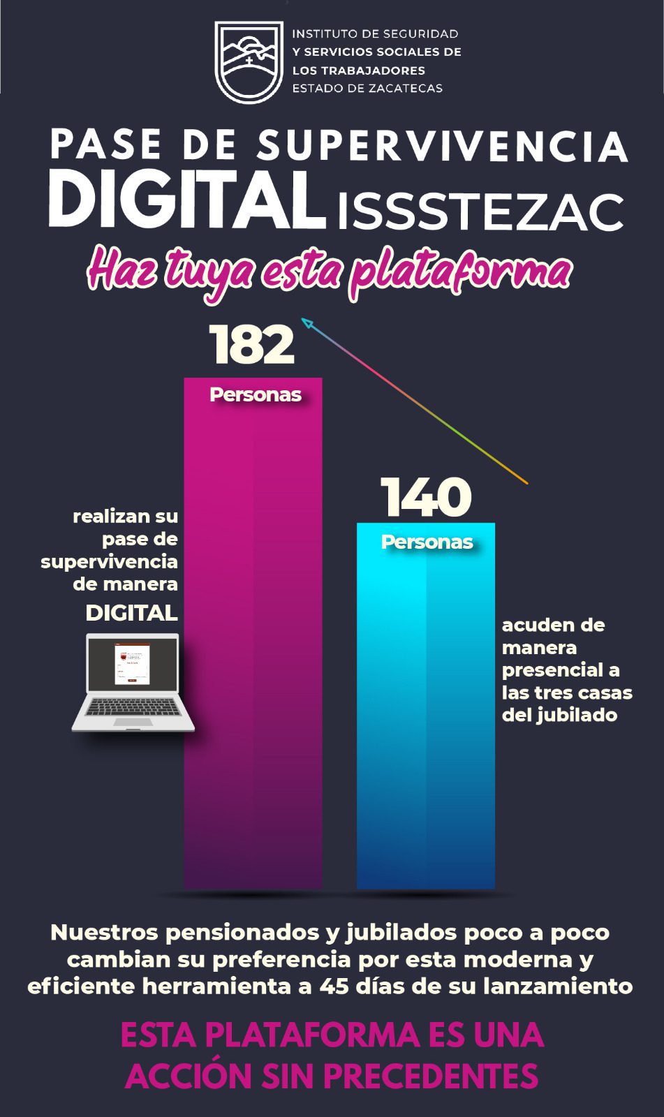 “Los registros aceptados de Pase de Supervivencia por medio digital de la grabación de un video es de 182 videos validados, mientras que 140 personas han realizado el trámite de manera presencial en cualquiera de las tres Casas del Jubilado, lo que demuestra que los pensionados y jubilados poco a poco cambian su preferencia por esta moderna y eficiente herramienta a 45 días de su lanzamiento”, declaró José Ignacio Sánchez González, director general del Issstezac.