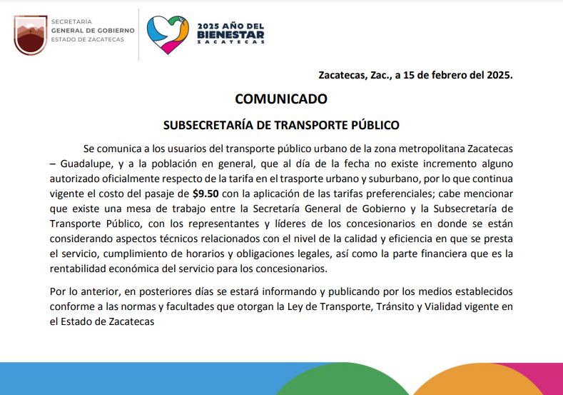 A pesar de que los concesionarios han planteado la necesidad de un ajuste en la tarifa debido a factores económicos, hasta ahora no hay autorización oficial para incrementar el costo del pasaje. Las autoridades estatales señalaron que cualquier modificación será informada de manera oficial y oportuna, conforme a lo establecido en la Ley de Transporte, Tránsito y Vialidad de Zacatecas.