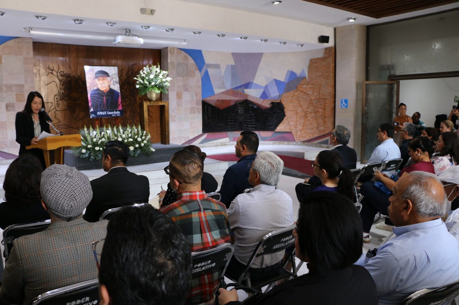 Mencionó que como su obra el muro “Bajo la roca”, situado en el vestíbulo de la Legislatura, donde se llevó a cabo el homenaje luctuoso, de gran fuerza simbólica, nos recuerda que el arte no es un lujo sino una forma de resistencia y memoria que nos deja herencia.