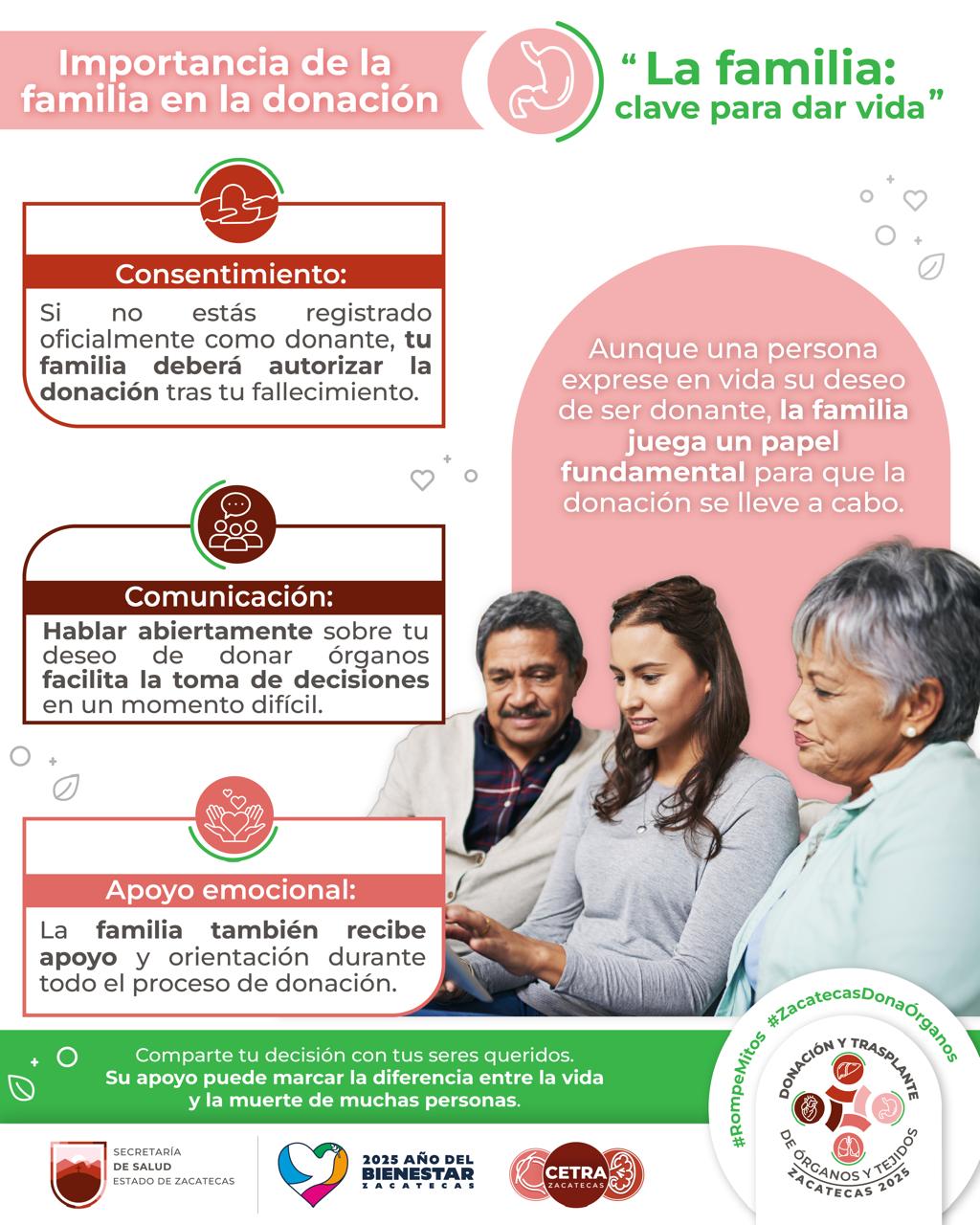 Zacatecas, Zac.- Fomentar valores relacionados con el altruismo y la generosidad es una acción emprendida por el Gobierno de Zacatecas, encabezado por el mandatario estatal David Monreal Ávila; a través de la Secretaría de Salud (SSZ), hace un llamado a la sociedad para hablar en familia sobre el tema de donación de órganos y tejidos.