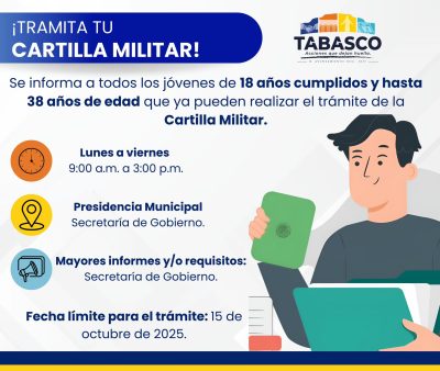 Tabasco, Zacatecas. – El Gobierno Municipal de Tabasco, a través de la Secretaría de Gobierno, informa a los jóvenes de entre 18 y 38 años de edad que ya se encuentra disponible el trámite para obtener la Cartilla del Servicio Militar Nacional.