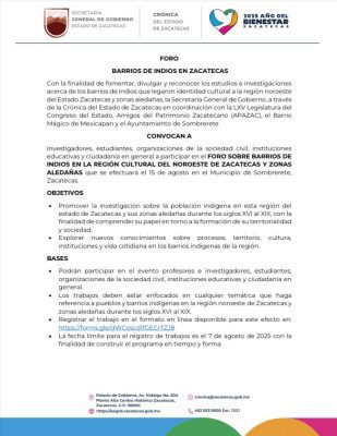 Zacatecas, Zac.- El Gobierno del Estado, que encabeza el mandatario David Monreal Ávila, a través de la Secretaría General de Gobierno y la Crónica del Estado, llevará a cabo el Foro Barrios de Indios en Zacatecas.