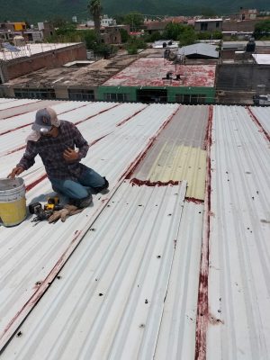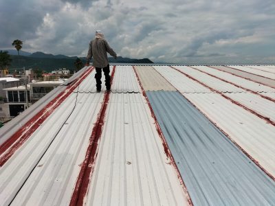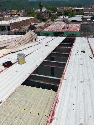 Personal del área de Obras Públicas lleva a cabo estas acciones en la Casa de Seguridad, el Mercado Morelos, la Casa de la Cultura y las canchas techadas de la cabecera municipal, con el objetivo de proteger los inmuebles ante la temporada de lluvias y prolongar su vida útil.