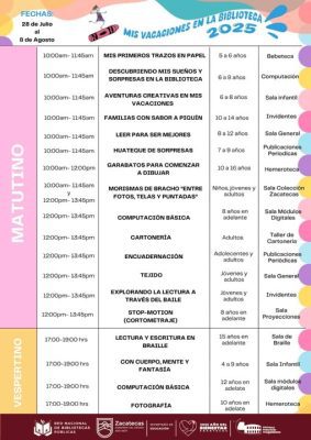 Los cursos de verano “Mis Vacaciones en la Biblioteca 2025” se realizarán en horario matutino y vespertino. Entre los talleres que se impartirán existe una diversidad de temas como: Mis primeros trazos en papel, Leer para ser mejores, Cartonería, Encuadernación, Tejido, Cortometrajes, Computación básica, Fotografía, por mencionar algunos.