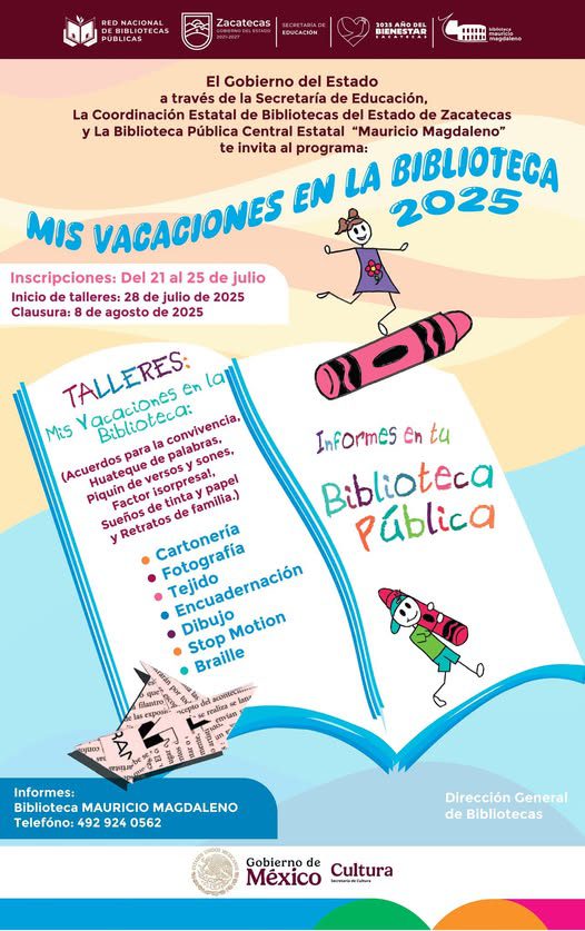Zacatecas, Zac.- La Biblioteca Pública Central Estatal “Mauricio Magdaleno” ya se encuentra lista para recibir a las niñas y niños en sus tradicionales cursos de verano “Mis vacaciones en la biblioteca, 2025”.