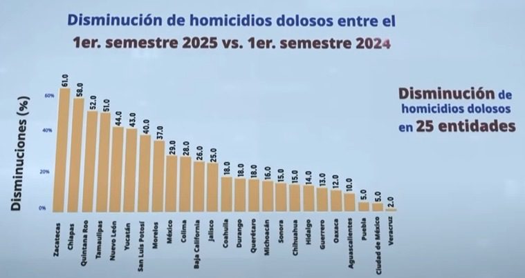 Durante el informe de seguridad correspondiente al primer semestre de 2025, se dio a conocer que Zacatecas registró una reducción del 61 por ciento en homicidios dolosos en comparación con el mismo periodo del año anterior. A nivel nacional, el promedio diario de homicidios dolosos bajó 24.5 por ciento entre junio de 2024 y junio de 2025.