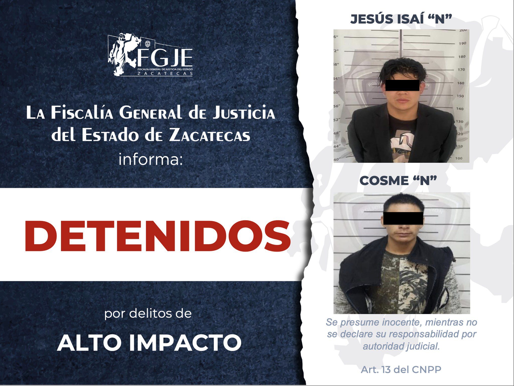 Zacatecas, Zac. — La Fiscalía General de Justicia del Estado de Zacatecas informó sobre la detención de dos personas presuntamente vinculadas a delitos de alto impacto, como extorsión y desaparición cometida por particulares, en hechos registrados en los municipios de Fresnillo y Villa de Cos, respectivamente.