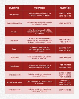 En Villa Hidalgo, está en Calle Miguel Hidalgo y Costilla s/n, Colonia Miguel Hidalgo y Costilla, C.P. 98990. Teléfonos: 4961198386 y 4969652489.