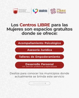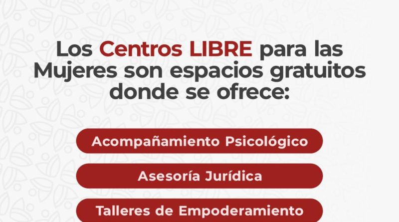 Los Centros LIBRE para las Mujeres (Libertad para decidir, Igualdad sustantiva, Bienestar integral, Redes de apoyo entre mujeres y Emancipación frente a las violencias) son espacios gratuitos donde se ofrece acompañamiento psicológico, asesoría jurídica, talleres de empoderamiento y desarrollo personal, con atención profesional y especializada.