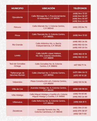 En Villa de Cos, se encuentra en Avenida Hidalgo 5, Colonia Centro, C.P. 98430. Teléfono: 4581089664.