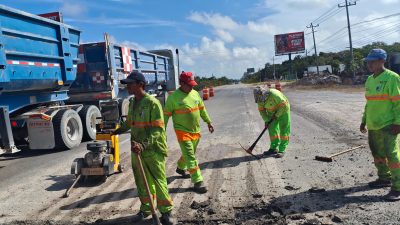 Cuadrillas de la SICT atendieron también 18 mil 855 baches detectados en la carpeta asfáltica, con el apoyo de 12 mil 985 toneladas de mezcla asfáltica, en una superficie de 77 mil 293 metros cuadrados.
