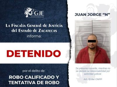 -Juan Jorge “N”, detenido en Fresnillo, por contar con una orden por robo calificado y tentativa de robo.