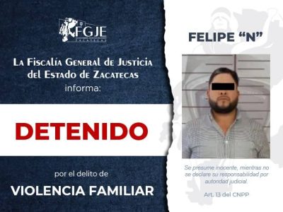 -Felipe “N”, aprehendido en el municipio de Sombrerete, por su presunta responsabilidad en el delito de violencia familiar.