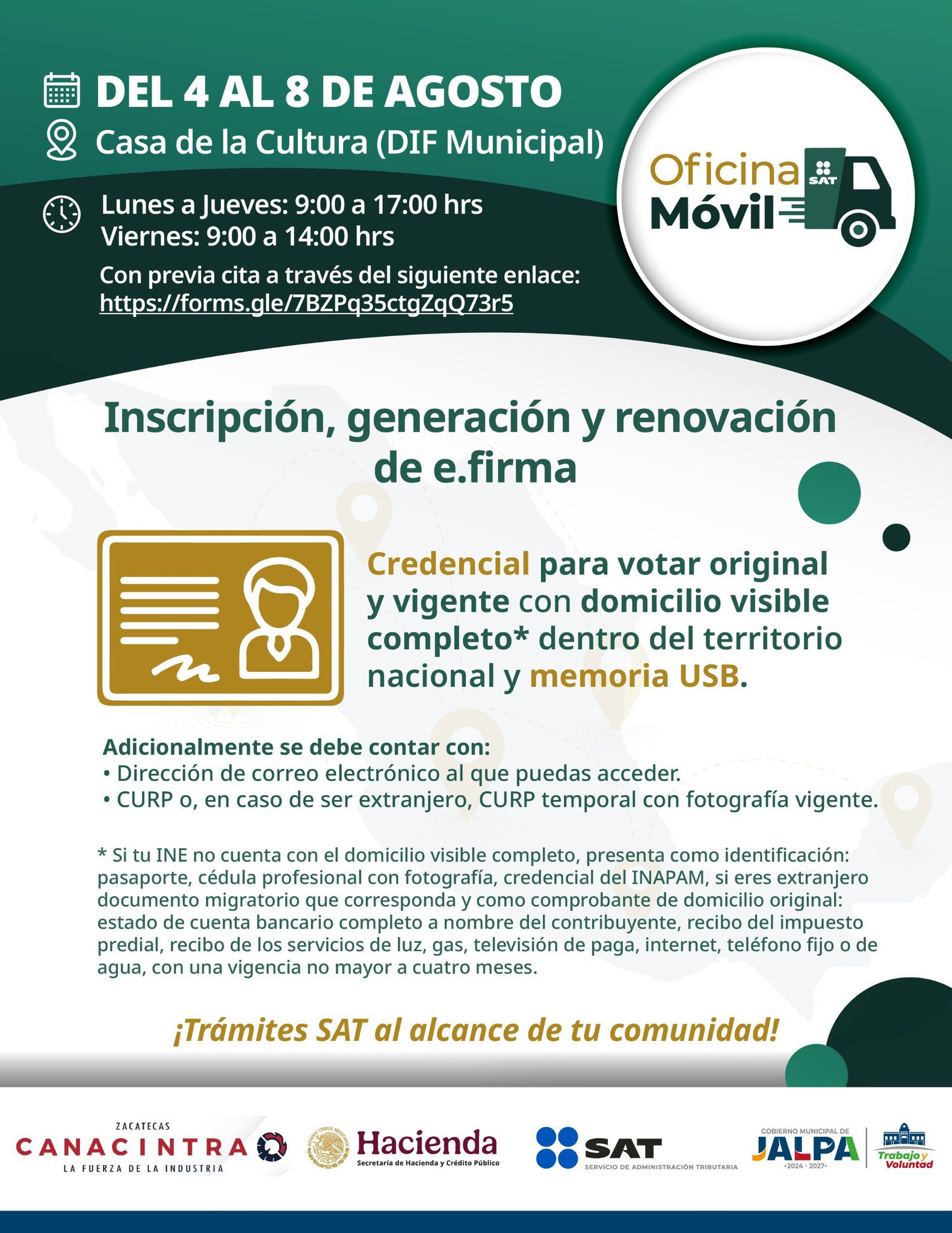 Jalpa, Zacatecas. — Este lunes comenzaron las actividades de la Oficina Móvil del Servicio de Administración Tributaria (SAT) en Jalpa, instalada temporalmente en las instalaciones del DIF Municipal. El alcalde Olegario Viramontes encabezó el arranque de los trabajos, acompañado por Alfonso del Real, representante del SAT en Zacatecas, e Ignacio Rentería, integrante de CANACINTRA.