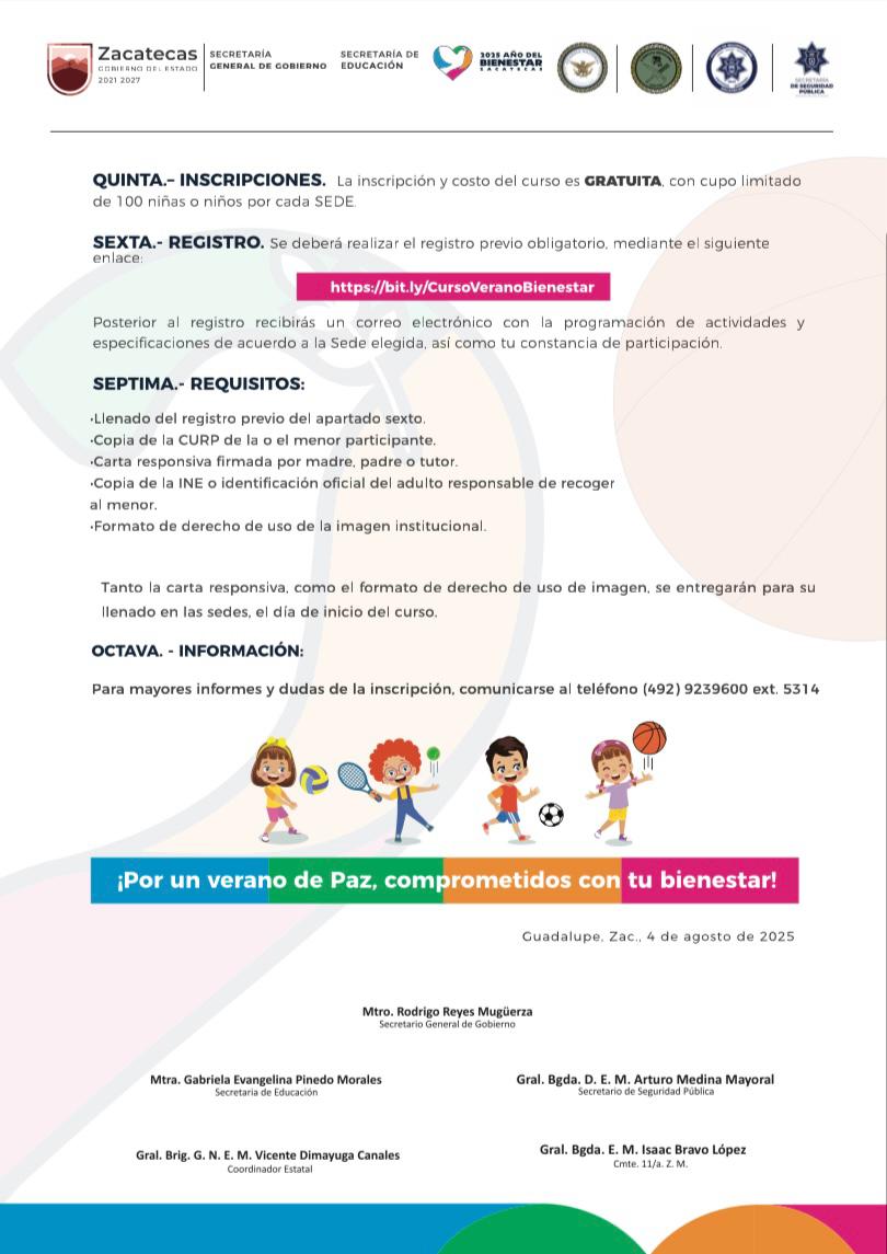 Para poder inscribirte, deberán ingresar a https://bit.ly/CursoVeranoBienestar y llenar el registro; además, requerirán de una copia de la CURP de quienes asistirán, una carta responsiva firmada por la madre, padre o tutor, copia del INE e identificación oficial del adulto responsable de recoger al menor y formato de derecho de uso de la imagen institucional.