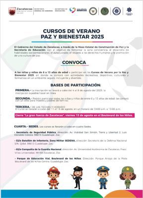 Zacatecas, Zac .- El Gobierno de Zacatecas, que encabeza el mandatario estatal David Monreal Ávila, llevará a cabo, del 11 al 15 de agosto, los cursos de verano Paz y Bienestar, en los que podrán participar niñas y niños de 6 a 13 años de edad, de manera gratuita.