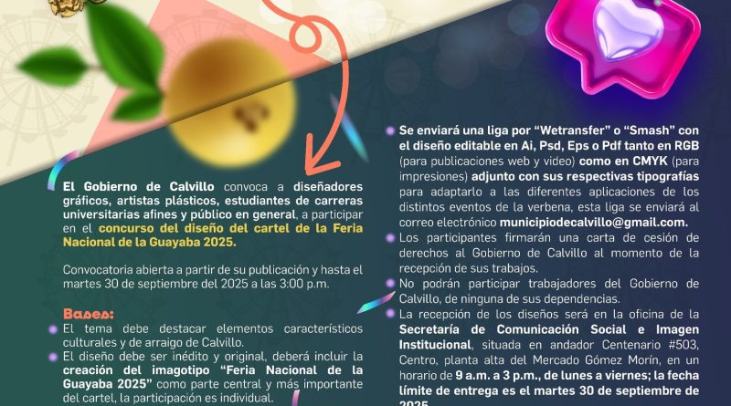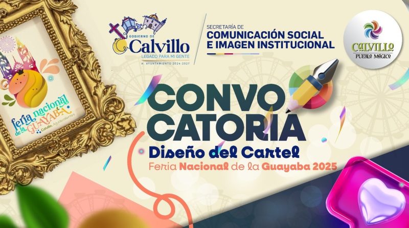 Calvillo, Aguascalientes.- El Gobierno Municipal de Calvillo, a través de la Secretaría de Comunicación Social e Imagen Institucional, invita a diseñadores gráficos, artistas plásticos, estudiantes y público en general a participar en el concurso para el diseño del cartel oficial de la Feria Nacional de la Guayaba 2025.