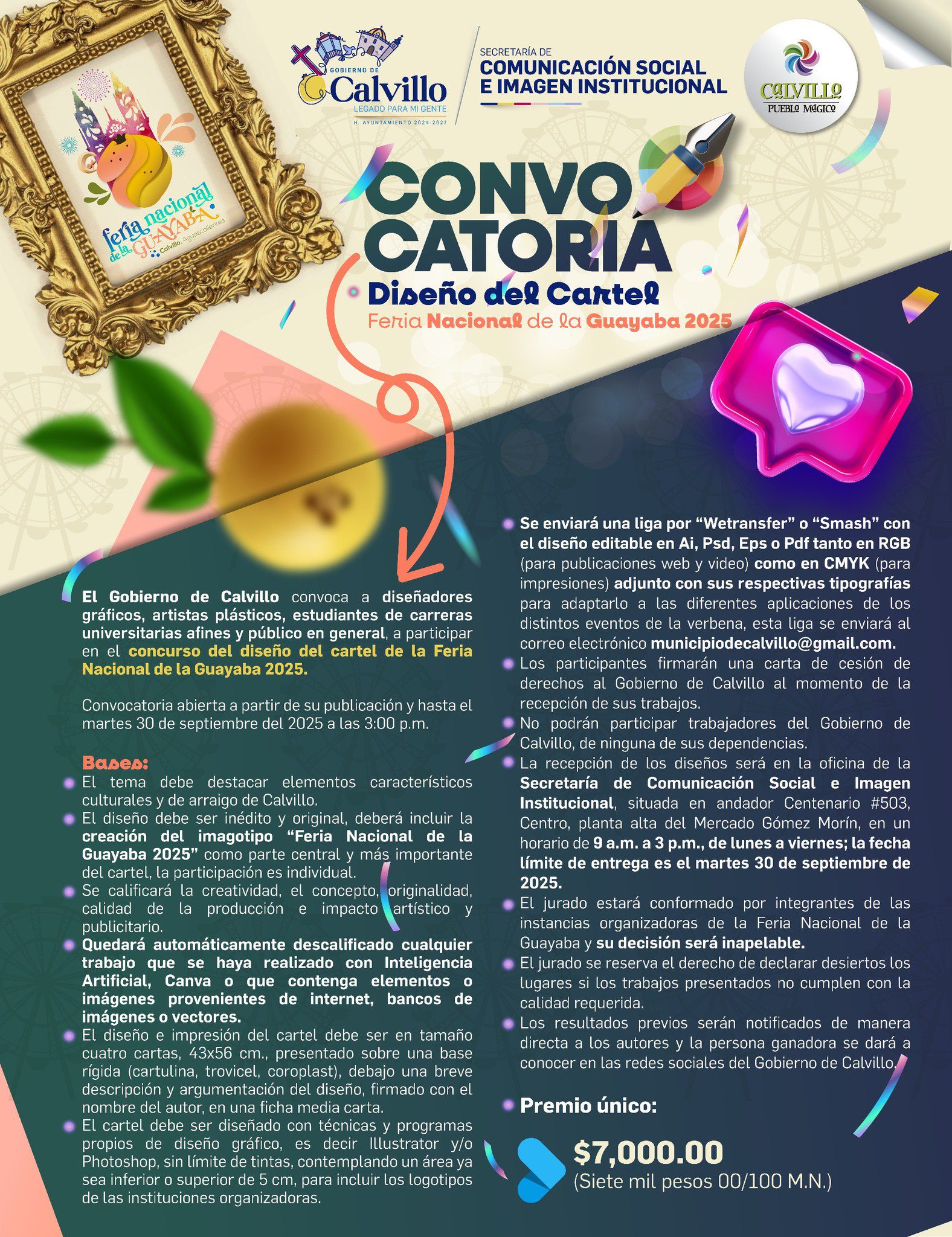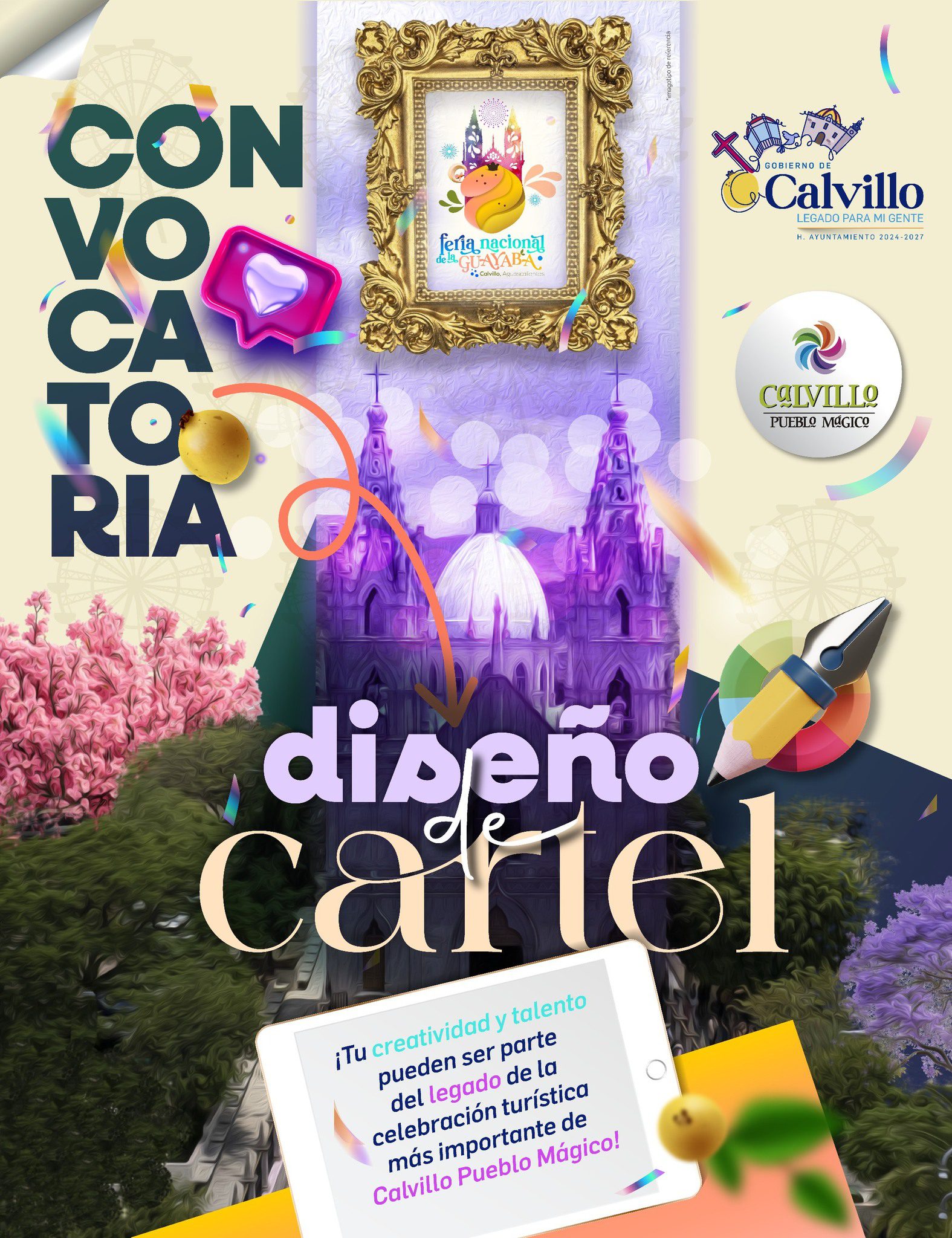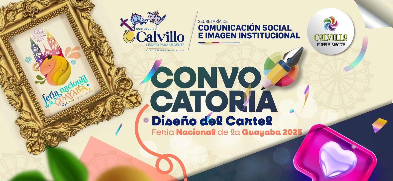 Calvillo, Aguascalientes.- El Gobierno Municipal de Calvillo, a través de la Secretaría de Comunicación Social e Imagen Institucional, invita a diseñadores gráficos, artistas plásticos, estudiantes y público en general a participar en el concurso para el diseño del cartel oficial de la Feria Nacional de la Guayaba 2025.