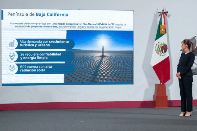 Ciudad de México, 26 agosto de 2025.- El Gobierno de México, a través de la Secretaría de Energía y la Comisión Federal de Electricidad (CFE), anunció la construcción de dos centrales termosolares en Baja California Sur —las primeras en su tipo en el país—, con lo que se beneficiará a entre 100 mil y 200 mil hogares con una inversión de 800 millones de dólares (mdd), como parte del Plan de Fortalecimiento y Expansión del Sistema Eléctrico Nacional 2025-2030.